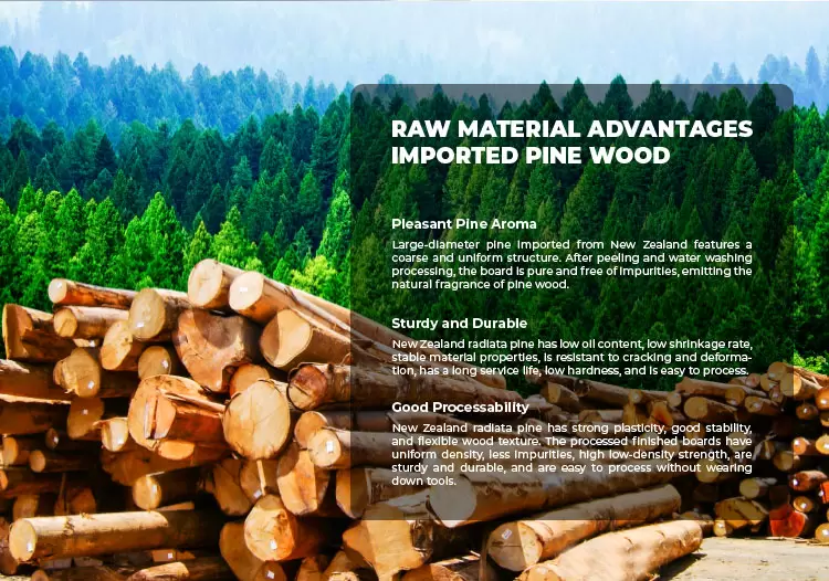 Large-diameter pine imported from New Zealand features a coarse and uniform structure. After peeling and water washing processing, the board is pure and free of impurities, emitting the natural fragrance of pine wood.
